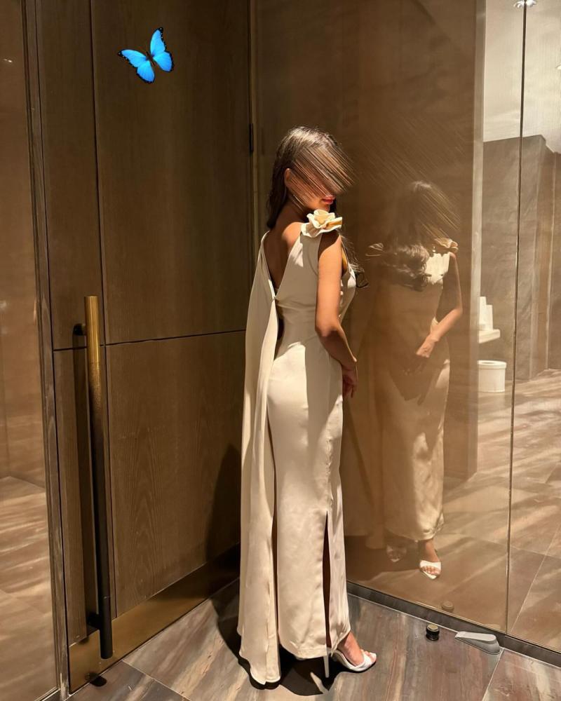 أسفل الفستان توجد فتحتان من الجانبين، تمنحان الفستان لمسة من العصرية والحركة، مما يضيف إليه مظهرًا ديناميكيًا وجذابًا أثناء المشي. الفستان مثالي للمناسبات الرسمية أو السهرات، حيث يجمع بين الأناقة والبساطة.
