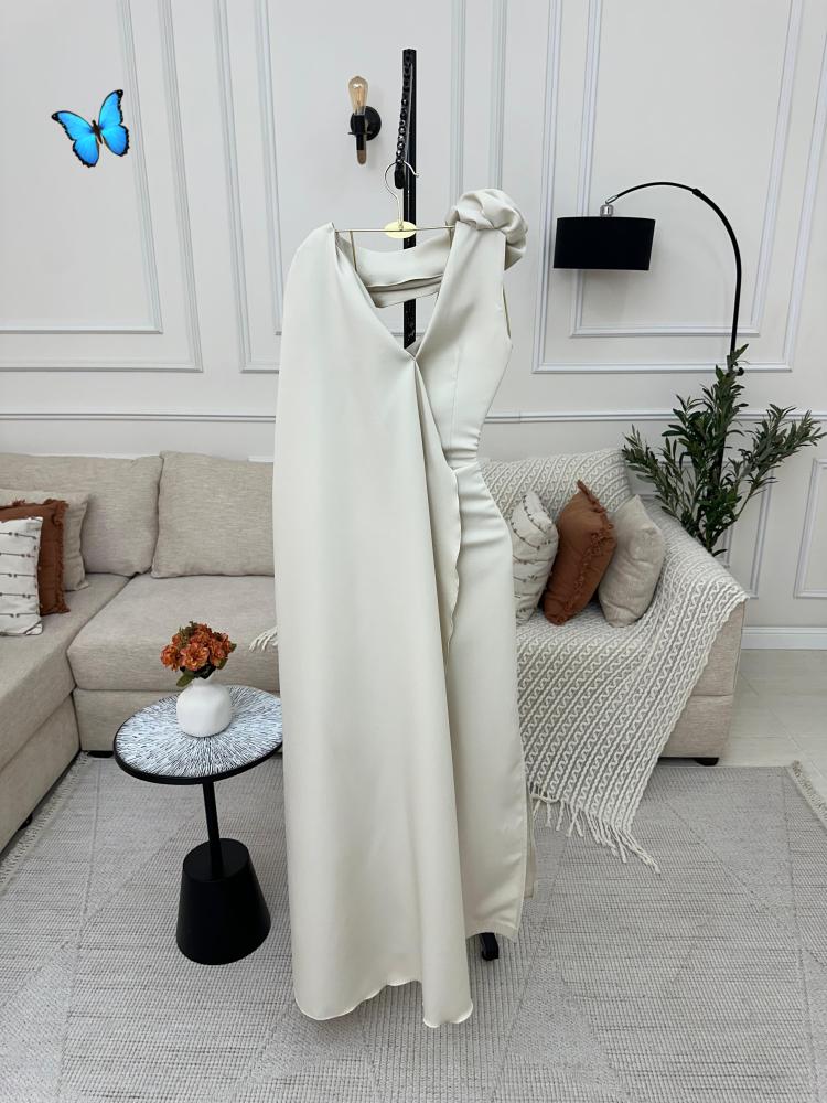 فستان طويل بيج يتميز بتصميم أنيق وجميل. الفستان مصنوع من قماش التفتة الباربي الناعمه ، ما يضيف عليه لمسة من الفخامة والنعومة. يتميز الفستان بوجود فيونكة كبيرة على منطقة الكتف ، تضيف لمسة أنثوية مميزة وتبرز الإطلالة بشكل جذاب. كما يترافق مع شال بنفس اللون ، مما يمنح إطلالة متكاملة ومريحة.