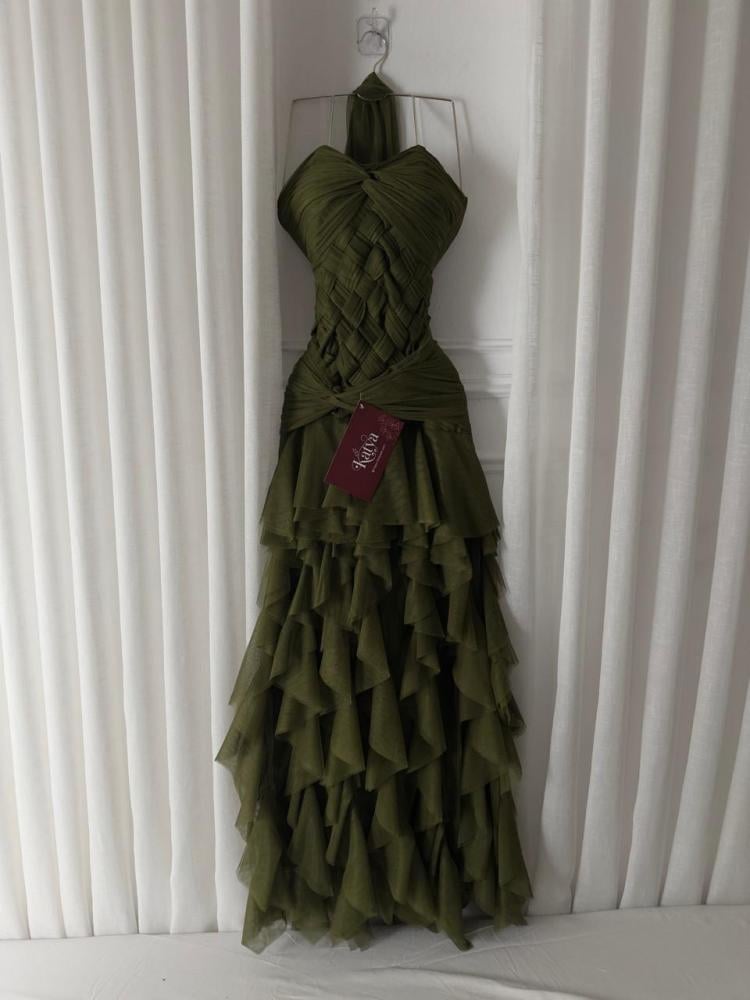 فستان سهرة أنيق بلون زيتي فاخر، يتميز بتصميم جذاب يجمع بين الفخامة والأنوثة. الجزء العلوي مصنوع بتفاصيل ضيقة منسوجة بطريقة فنية متقنة تبرز جمال القوام، مع رقبة هالتر أنيقة تضيف لمسة راقية. أما التنورة، فتتكون من طبقات متعددة من التول الناعم على شكل كشكش متدرج يمنح الفستان حجماً وانسيابية رائعة أثناء الحركة. فستان مثالي للسهرات والمناسبات الخاصة يمنح إطلالة فخمة وساحرة.