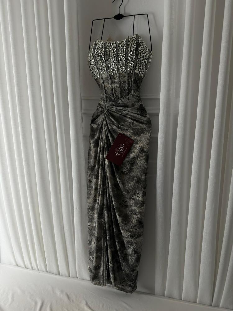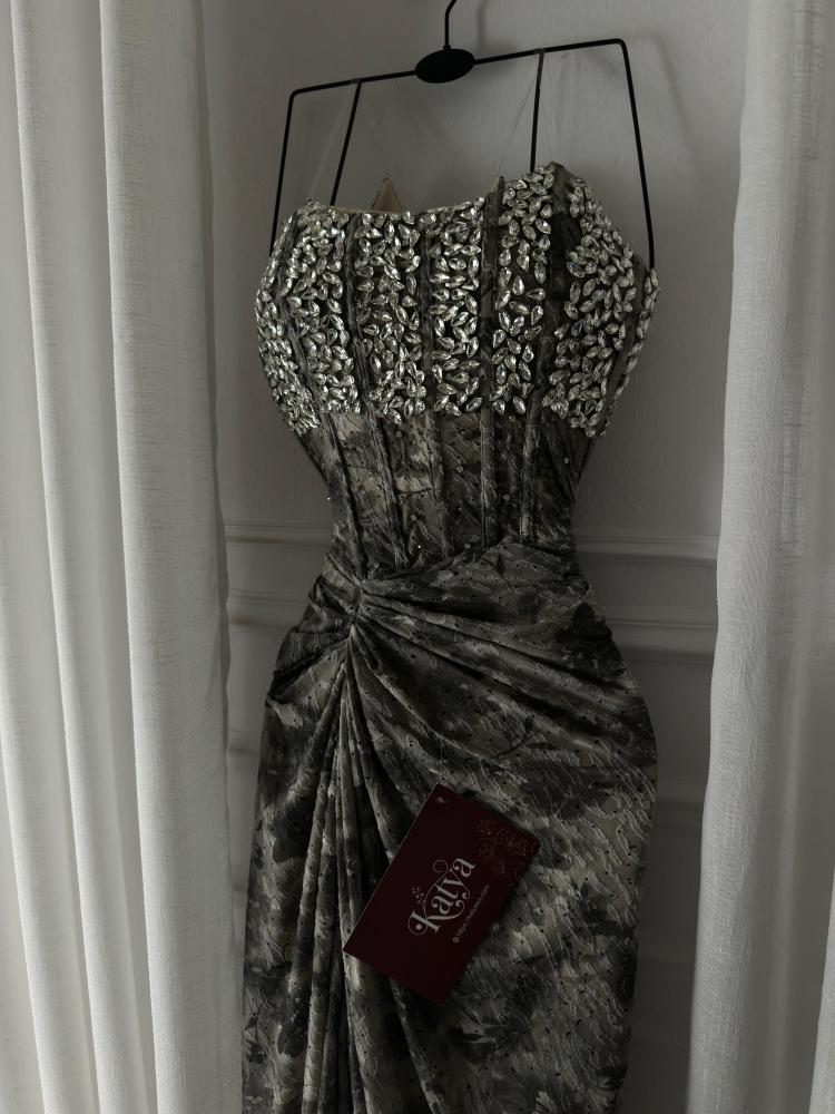 فستان بدانتيل علا فصوص بنفس القماش